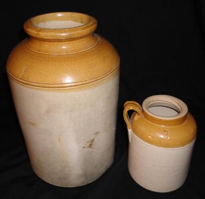 Title (ebay affiliate link): 2 Antique Stoneware Jars #1 #2 Gold & White Crocks Beer Whiskey Jars