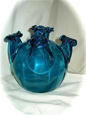 VTG Hand Blown Blue Art Glass FLOWER FROG VASE w/ 5 Hole Inserts