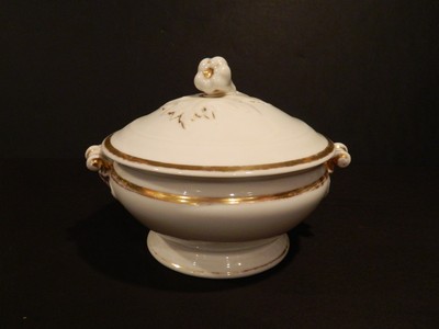 Title (ebay affiliate link): White Ironstone Serving Casserole Covered Garlic Finial Gold Trim Antique