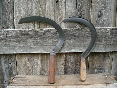 Title (ebay affiliate link): 2 Old Primitive Hand Grass Scythes Sickles ~ Farm Permaculture Homesteading Tool