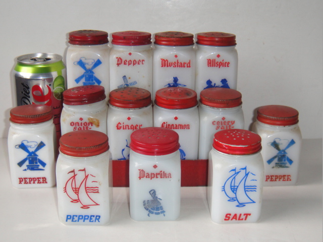 Vintage Tipp Milk Glass Dutch Spice Jar Shaker Set Rack