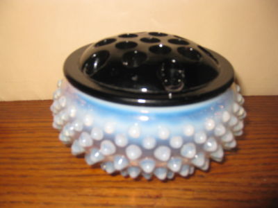 Vintage BLACK Glass Floral Frog w/Moonstone Hobnail Box