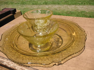 Title (ebay affiliate link): 2 YELLOW DEPRESSION GLASS SHERBET DISHES/ BOWLS & PLATE