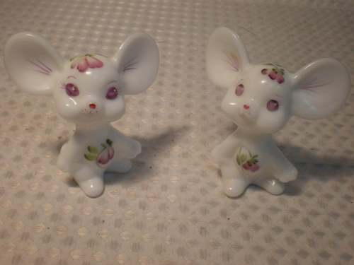 (r) 3" Handpainted Mice Mouse Milk Glass Pair
