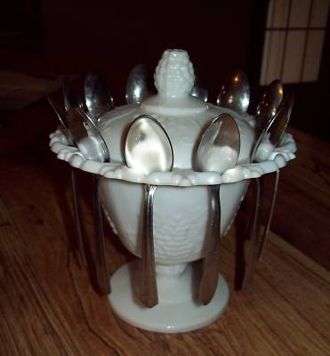VINTAGE WHITE MILK GLASS SUGAR BOWL WITH 12 SPOONS