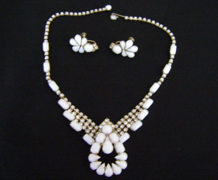 VINTAGE MILKGLASS AND RHINESTONE DEMI PARURE MILK GLASS