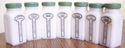 7 Griffith's Spice Jars Milk Glass Vintage Jade Caps