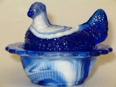 COBALT MILK SLAG GLASS HEN CHICKEN ON NEST BASKET DISH