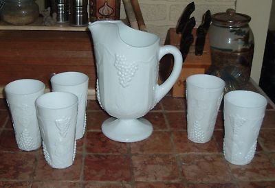 Vintage White Milk Glass Harvest Grape Pitcher Tumblers