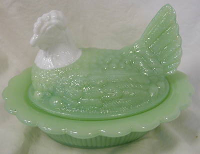 Green Milk Glass w/White Milk Head Covered Chicken Box