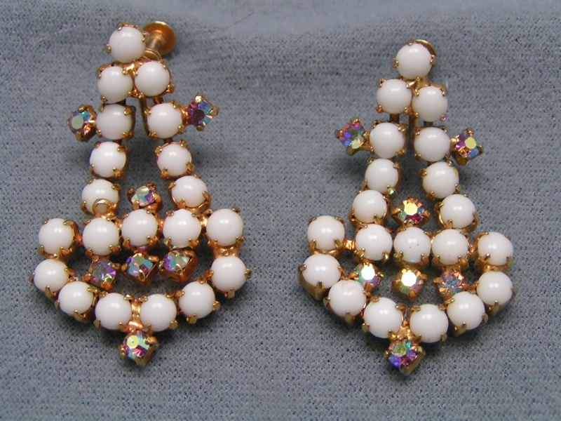 Vtg HUGE White Milk Glass AB Rhinestone Earrings JF26