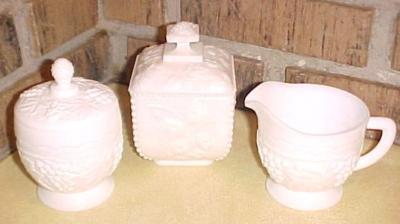MILK GLASS CREAM & SUGAR & CANDY DISH GRAPES & LEAVES