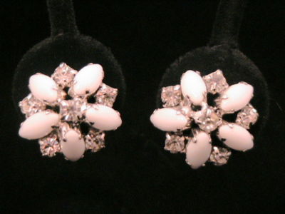 Vintage Milk Glass & Clear Rhinestones Clip-on Earrings