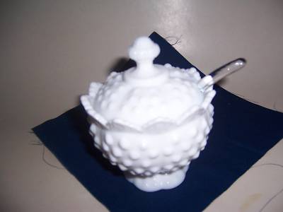 Fenton White Milk Glass Hobnail Covered Jam Jar w/Spoon