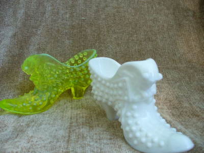 2 Fenton Shoes w/Cat Hobnail Milk Glass Vaseline
