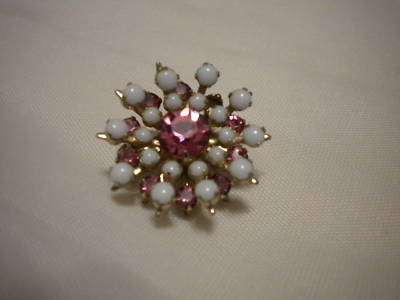 Vintage Brooch/Pin Milk Glass & Pink Rhinestones