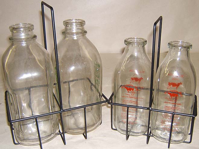 4 Old milk bottles w carriers Vermont McLaughlin dairy