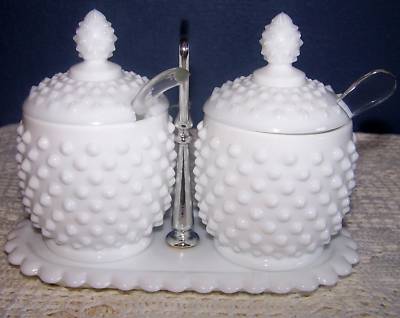 Scarce 7 Pc Fenton Milk Glass Hobnail Jam & Jelly Set