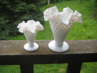 Title (ebay affiliate link): Fenton Hobnail Milk Glass Ruffled Edge Vase Set Two