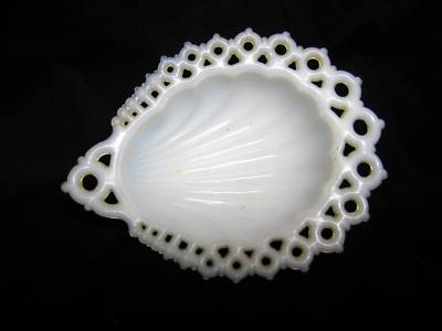 ANTIQUE MILK GLASS 5" SHELL DISH w/OPEN LACE EDGE FOOTE