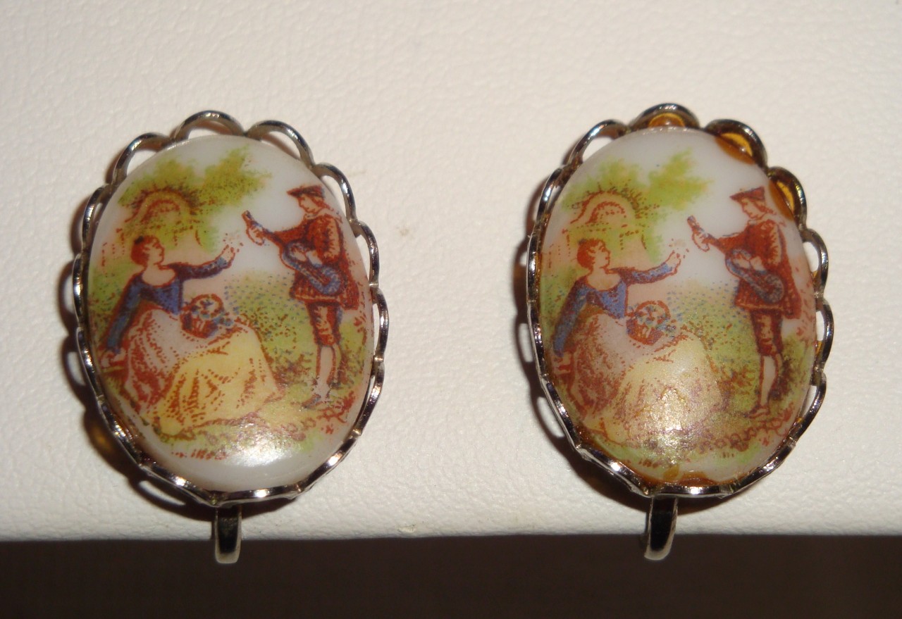 Vintage White Milk Glass Courting Cameo Earrings Sign