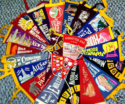 Title (ebay affiliate link): LOT OF 21 VINTAGE SOUVENIR OR TRAVEL PENNANTS FLAGS #33