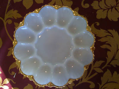VINTAGE MILK GLASS DEVILLED EGG SERVING PLATE GOLD TRIM