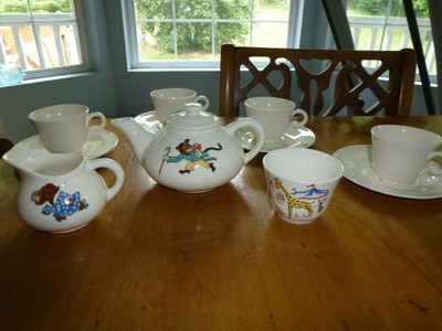 Title (ebay affiliate link): 1942 Vintage Childs Tea Set Circus Zoo Animal Pattern Teapot Cream Sugar Cups