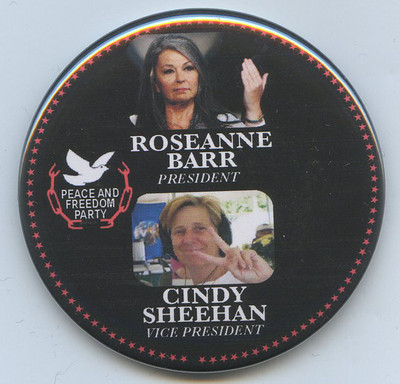 Title (ebay affiliate link): Roseanne Barr Cindy Sheehan Peace & Freedom Party 2012 button
