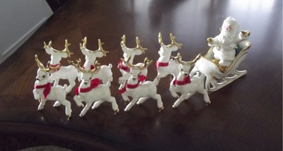 Title (ebay affiliate link): VINTAGE PORCELAIN SANTA, SLEIGH, REINDEER-WHITE & GOLD-NICE!