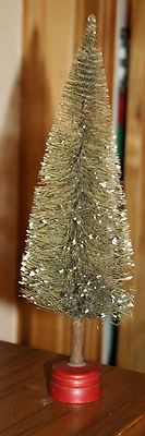 Title (ebay affiliate link): 12.50" Tall Green Brush Tree. Red wooden Bases. Made in U.S.A.. Snow Covered
