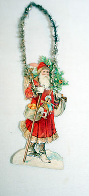 Title (ebay affiliate link): Santa Claus, Walking Stick, Toys. 1890s Paper & Tinsel German Xmas Ornament.