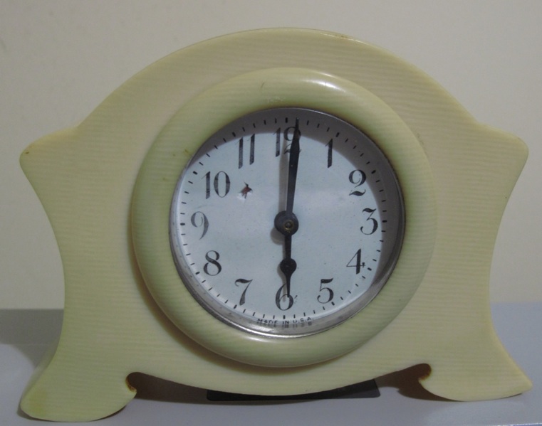 Title (ebay affiliate link): 1930s White Faux Ivory Xylonite Small Mantle Clock With Enamel Face USA Movement