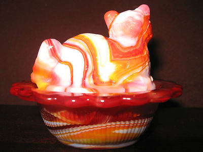 Title (ebay affiliate link): Ruby Red & milk slag glass salt cellar celt cat kitten kitty on nest basket dish