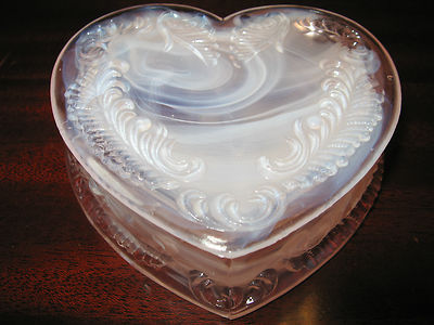 Title (ebay affiliate link): Pink & milk slag glass heart pattern powder jewelry box dresser tray holder ring