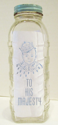 Title (ebay affiliate link): TO HIS MAJESTY VINTAGE GLASS BABY MILK BOTTLE & LID FOR BOY BY SAMUEL CALLET CO
