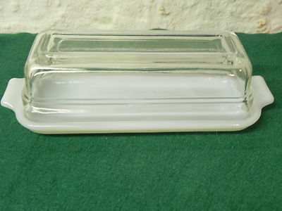 Vintage Fire King butter dish with lid milk glass bottom and clear glass top