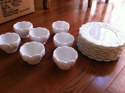 Title (ebay affiliate link): Westmorland White Paneled Grape Leaf Milk Glass Salad Plates And Small Bowls