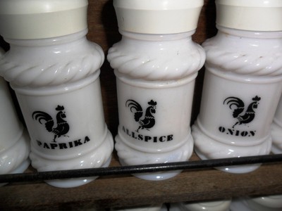 Title (ebay affiliate link): 16-piece Milk glass Spice Shakers w/ Rooster Design with Wood Wall hanging Rack