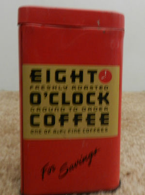 VINTAGE ANTIQUE EIGHT O'CLOCK COFFEE METAL TIN COIN BANK IN EUC