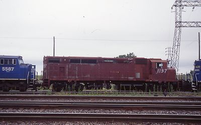 MBTA GP40-2MC # 1137 in transit @ primer on CR @ Buffalo NY 8/10/1997