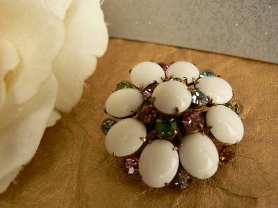 WHITE MILK GLASS & COLOR RHINESTONES VINTAGE PIN BROOCH