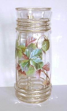 ANTIQUE ENAMELED GLASS VASE CHESTNUT LEAVES & FRUIT GOLD TRIM NR