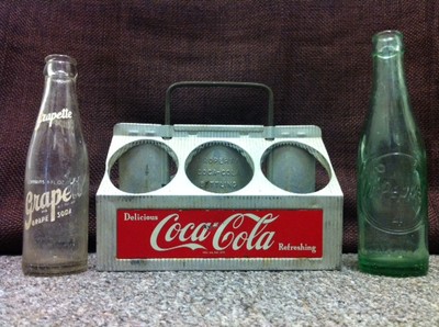 1950's Coca Cola embossed 6 Pack Bottle Carrier, 1955 Dr Pepper Bottle, Grapette