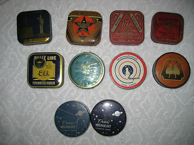 VINTAGE LOT OF TYPEWRITER RIBBON TINS 10 TINS/INTL PENGUIN/KEELOX/FLAX/MILLER
