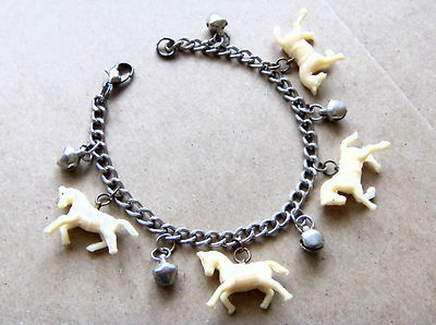 Title (ebay affiliate link): Cracker Jack Charm Bracelet made w/ Vintage Celluloid Horse Charms and Bells