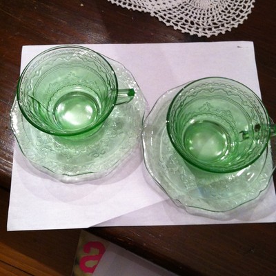 Antique Green Depression Glass PATRICIAN SPOKE 2 Teacups And Saucers