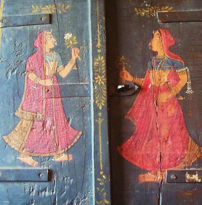 Title (ebay affiliate link): ANTIQUE PRIMITIVE HAND PAINTED RECLAIMED WOOD PLAQUE CUPBOARD DOORS INDIA WOMEN