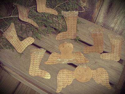 Title (ebay affiliate link): Primitive Christmas Decor Ornaments Aged 9 Paper Ornies Stocking Angels ~DN