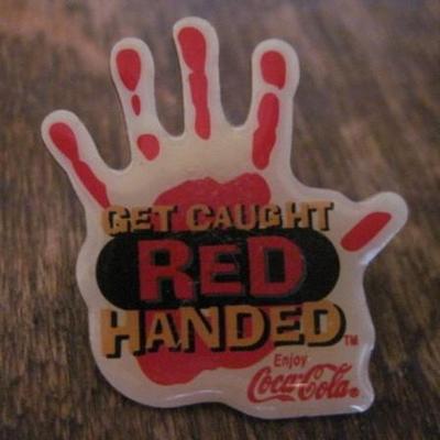 Title (ebay affiliate link): Vtg Coca Cola Coke Get Caught Red Handed Hand PinBack Hat Pin Give-away Premium